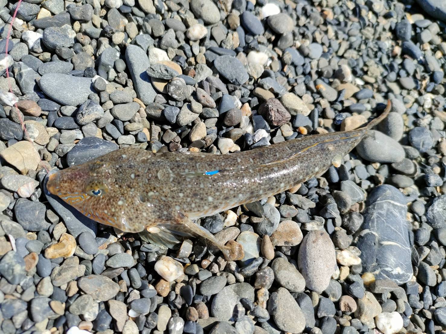 とりあえず投げれるだけ飛ばしてゆっくり仕掛けを動かしながらさびいてくると、すぐにアタリ♪早速、20cm近い良型のメゴチが釣れました。