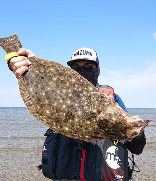 DUOフリッパーZ24 先日の雨の影響で濁りがあるので、底付近をストップ&ゴーで丁寧に探っていくと、ガツンと思いアタリが! 最初ドラグのでかたからエイかと思いましたが、底に貼り付くことなくファイトでヒラメだと確信しました! その後マゴチも追加でき、満足の釣果でした!