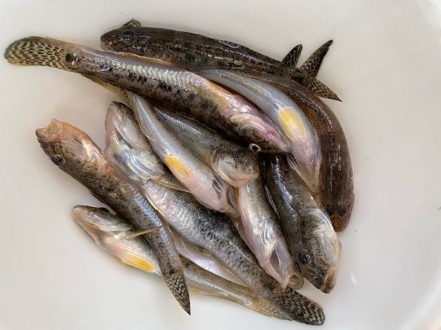 チョイ投げセット、遠投30m、1.5時間でハゼ10匹、曇り。