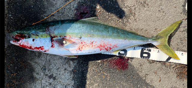疲れてくるしVJにチェンジしてヒラメでも狙おうと5投くらいしていると20m位前で何やら単発ボイル!一か八か射程圏内!投げて2~3回転!ガツン!ジーッ!ライン出る出る!この引きはデカい!5分位ファイトしてようやく浮いてきたのが75cmの丸太りのメジロでした!この一本で満足で帰りました!何やら単発ボイル!一か八か射程圏内!投げて2~3回転!ガツン!ジーッ!ライン出る出る!この引きはデカい!5分位ファイトしてようやく浮いてきたのが75cmの丸太りのメジロでした!この一本で満足で帰りました!