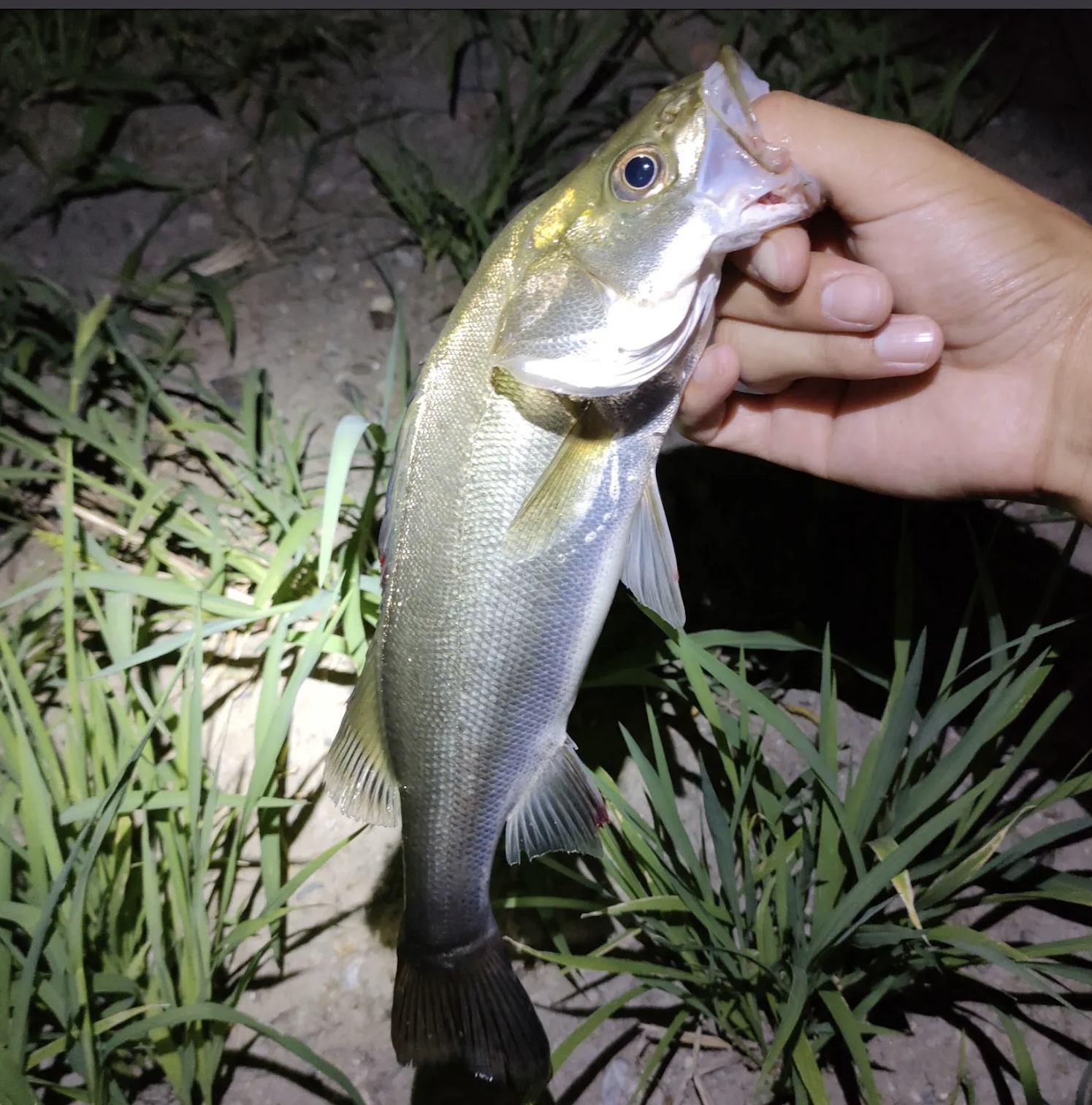 流れ込みにルアーを投げると1投目で30cmくらいのシーバスが釣れました!