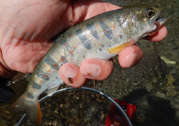 今回は、渓流釣り初心者の有事を連れて、アマゴ釣り入門編です。 竿の持ち方から振込、仕掛けの流し方、ポイントの見方をレクチャしてしばし練習しポイントに向かいました。 開始早々アマゴを釣り上げ会心の笑顔!昼過ぎまで楽しんで貰えました。 竿は6.1m、水中糸は0.3号、目印3か所、オモリは3~2B、ハリはナノヤマメ5号、エサはミミズとヒラタ