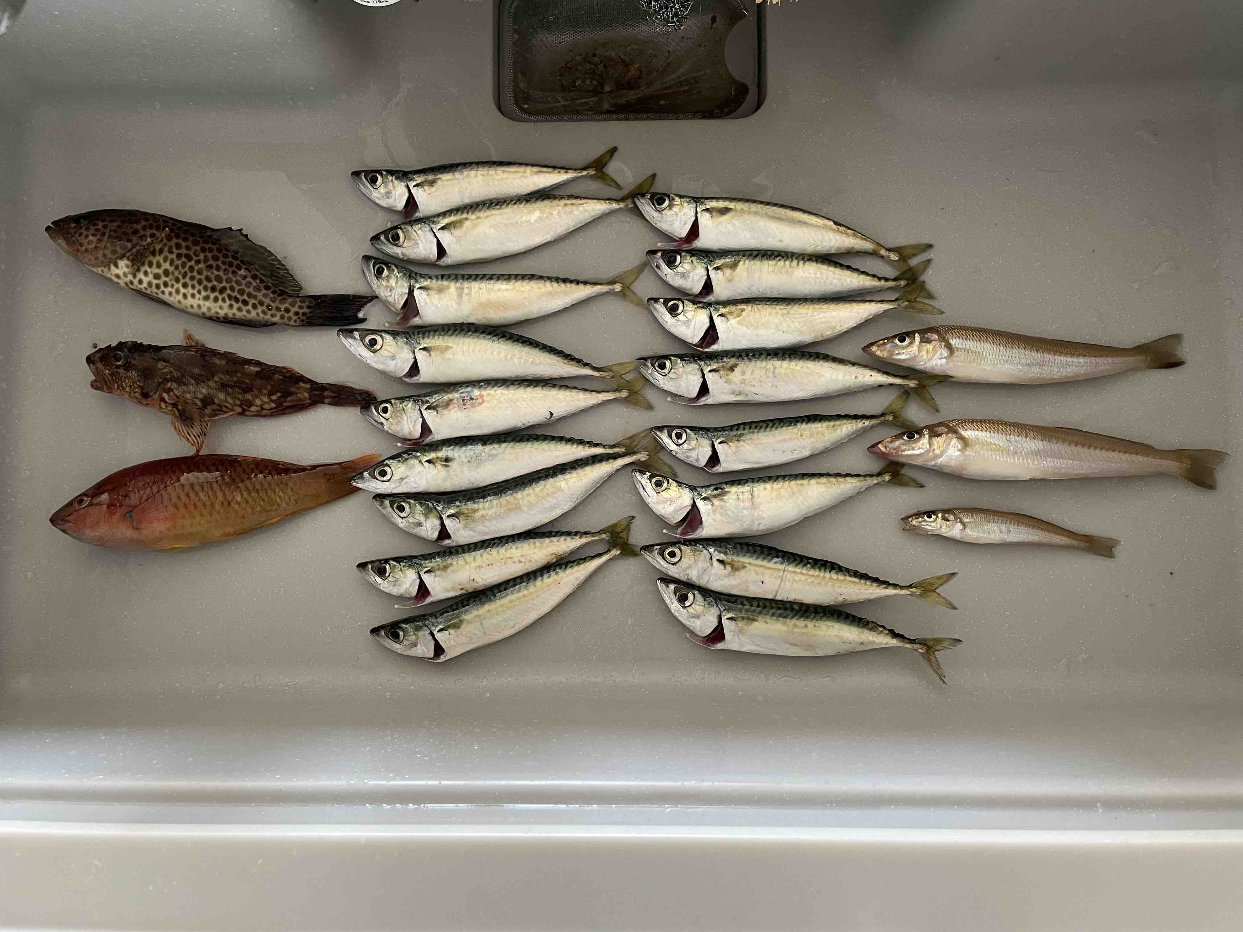 シーバスロットで堤防よりAM6時釣り開始 すぐにキス20cm 1匹22cm1匹 風が強く一旦休憩 15時オオモンハタ30cm カサゴ25cm 17時頃小鯖が回って来た為サビキで20匹ほど釣れる 潮止まりの為19時終了