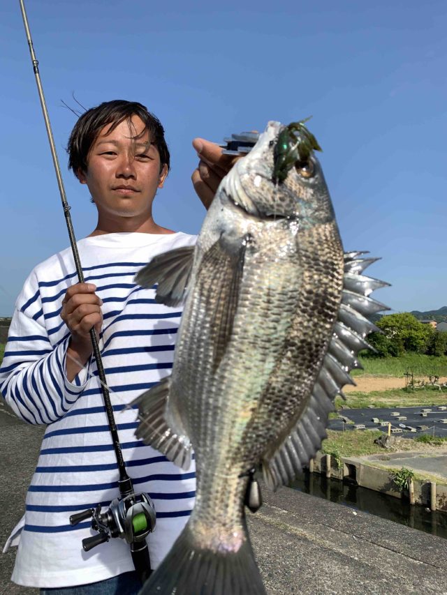 勢田川河口で真昼間の干潮からの上げ始めにフリーリグのチニングでマゴチと黒鯛が 釣れました。