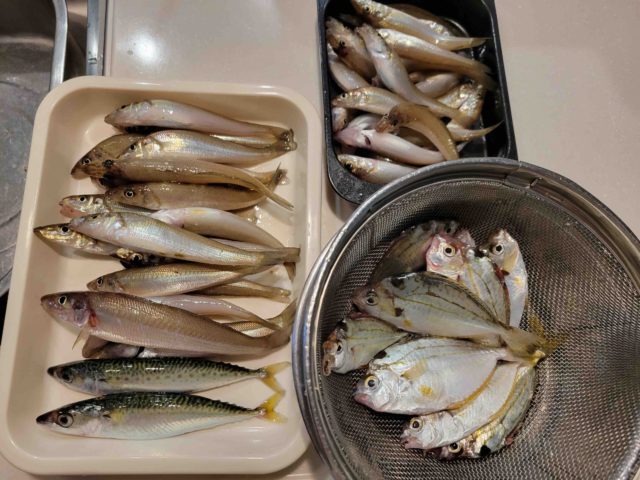早朝、大潮の満潮から干潮までで16㎝を頭にキス40匹 。 あまり大きくはないですが釣れる数は増えて来ました。 ヒイラギも大きくなってきたのでキスとはまた違った引きも楽しめます。 早朝には小サバも居ました。