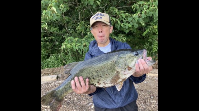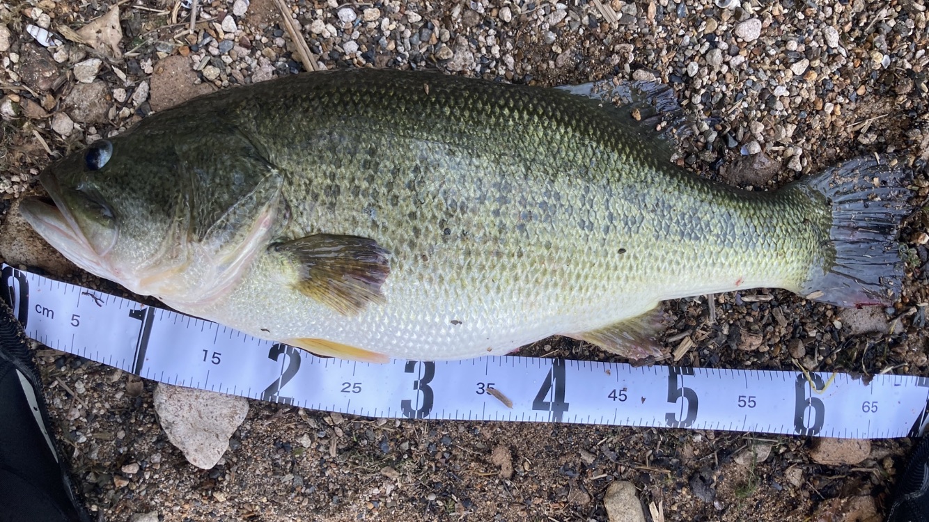 ロッド シマノゾディアス72MH リール 21アンタレス ライン フロロマイスタ14ポンド ルアー ジャッカルカバークローグランデ 天気は曇りで少し風が吹いててウィードはえていました。 ウィードに絡めながら時間を掛けながらズル引きで当たりがありました。 オカッパリからの66センチです。