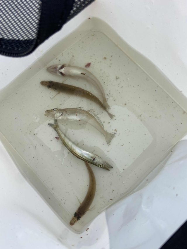 投げ釣り竿使用。 キスは石ゴカイで、あたりは何度もありましたが、なかなか乗りませんでした。 カマスは、足元でサビキ針とルアーがセットになった仕掛けを上下にしゃくっていたら掛かりました。