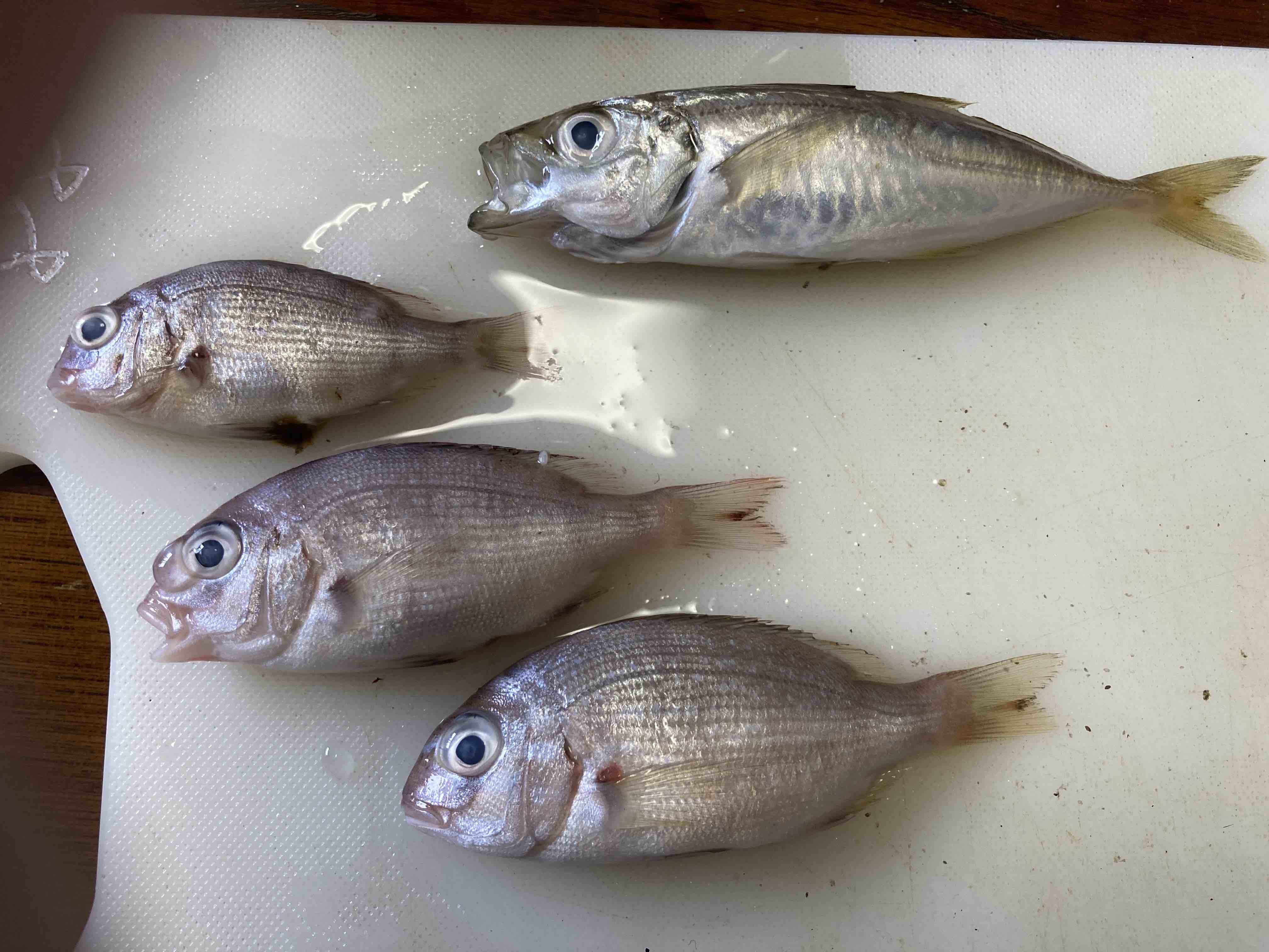 ちょい投げ竿とのべ竿3.3m ライン アンバーコート0.4号 ハリス 海王丸1号 おもり yo-zuri3B 針 OWNERキスR8号 エサ ゴールドイソメ 小雨のち晴れ 無風で波穏やか 小潮 満潮9時51分 干潮16時09分