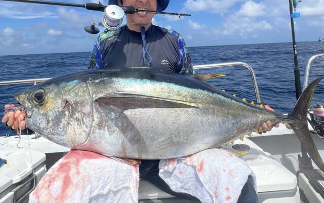 ロッドとリール共にスペックが魚に対して足りておらず大苦戦。船長や他のお客さんのサポートを受けて1時間のファイトの末メバチマグロを釣る事が出来ました。