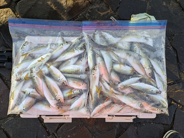 集魚灯有り。 トリックサビキ4号、シロメ、下カゴ有り、竿2本。 0時頃から鯵の活性が高くなり、2時頃まで入れ食い状態。