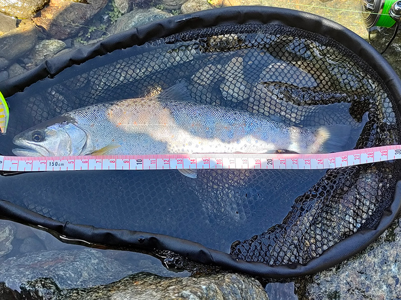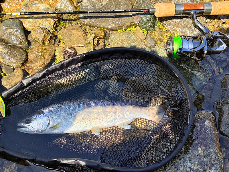 遠投して着水後沈めてからの巻き出しで強烈なバイト。慎重にやり取りしてネットイン。撮影後回復を待ってリリース。やはりアマゴは美しい
