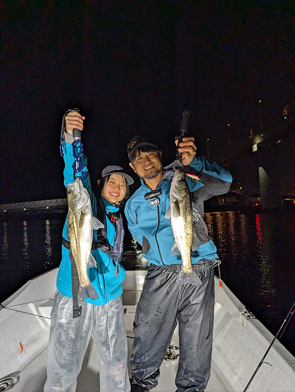 結果は自分が7匹、初挑戦の娘が5匹と上々。ストラクチャーについている魚をピンで狙うボートシーバスは最高にエキサイティングで面白いですね。