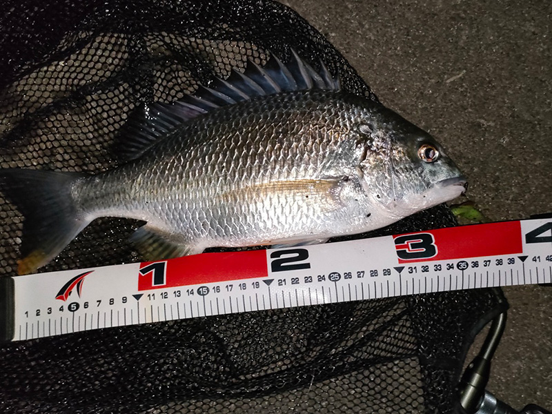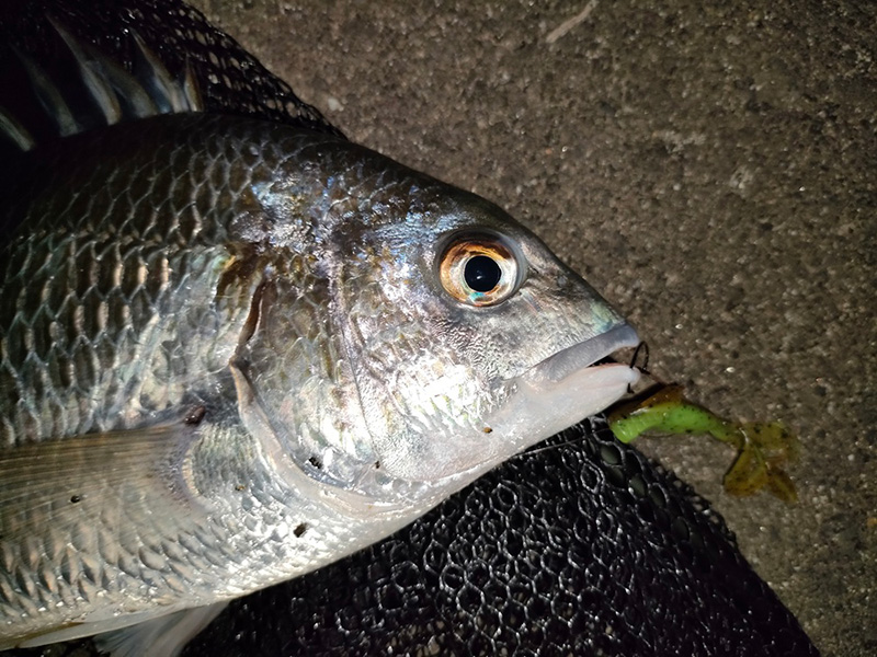 上げの潮止まりが近づきそろそろ終了と決めた直後のキャッチは銀ピカのキビレ。下顎皮一枚だった