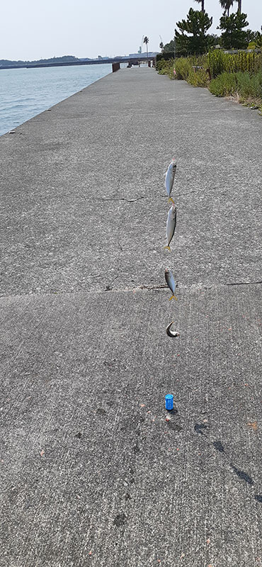 【使用タックル・当日の状況】 昼サビキは釣れないかな?と思いつつも久しぶりに竿をおろしたとたんにヒット。 2時間弱で45匹。 アミエビもなくなったので帰宅。 まだまだ釣れそうでしたが。 豆アジもちょいと大きくなってました。
