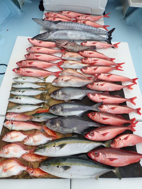 ジグには反応良くハチビキなどが各流し毎にヒットし船中大騒ぎでした。魚種も豊富でしかも良型ばかりで大満足で沖上がりでした。