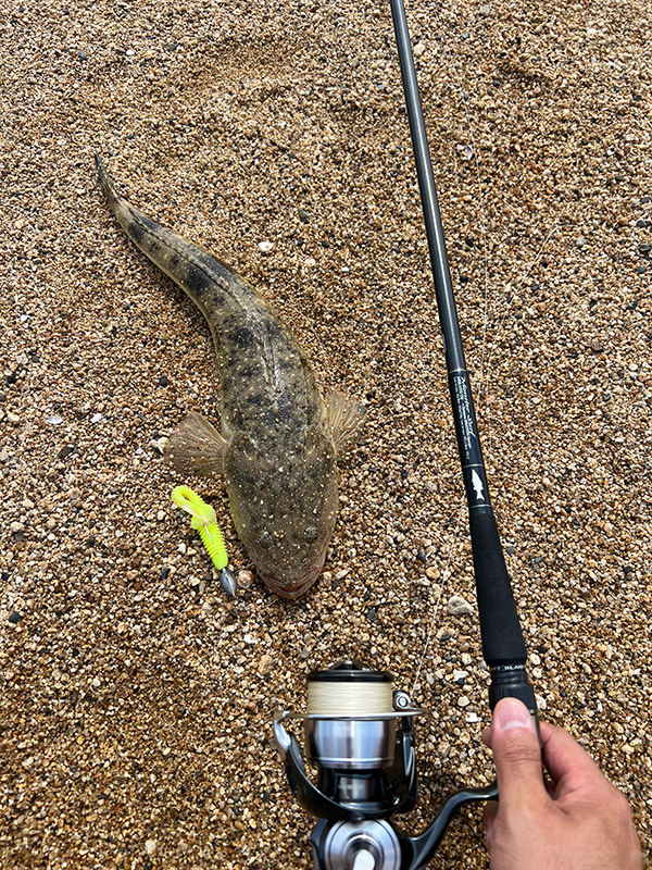 【使用タックル・当日の状況】 Gクラフトモンスターサーフ1072TR 24セルテートLT4000C ぶっ飛び静ヘッド18g スイングインパクト3.8インチゴルチャグロー ヒラメシャフトS ド干潮潮止まり 河川からのインレットのカレントに絡めてストップ&ゴー