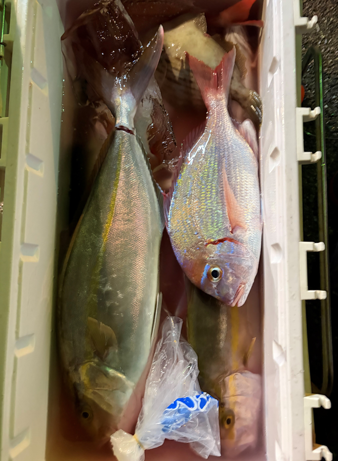 残念ながらシマアジや大型マダイは釣れませんでしたが、終了ギリギリまでアタリは断続的にあり、最終的にカンパチは7枚、小型のチダイやマダイが合計30枚ほどの釣果となりました。