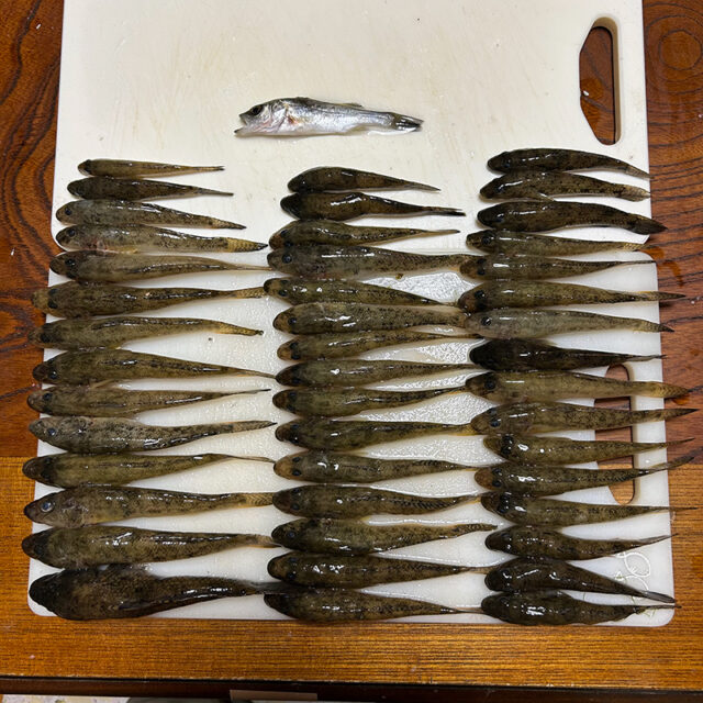 水が濁り見えなくなりましたらまたちょい投げに変更して結果セイゴを含め46匹釣れました。