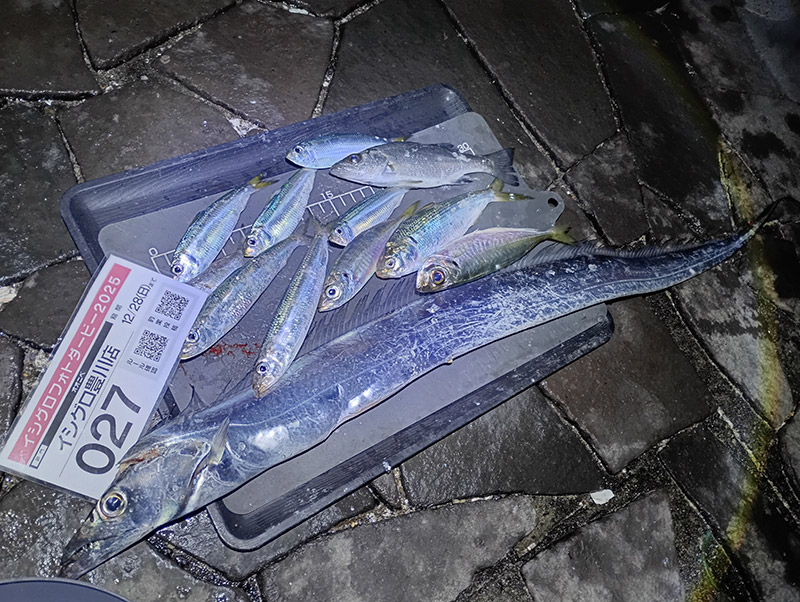 【使用タックル・当日の状況】 ダイワロッド30/210、レブロス3000、 深夜1:00に釣り開始。 かなり寒く誰もいない。 VJを投げるとサッパがスレがかり連発する。 シーバス&青物狙い撃ち。 なぜかタチウオゲットだぜ♪ 恵みに感謝☆