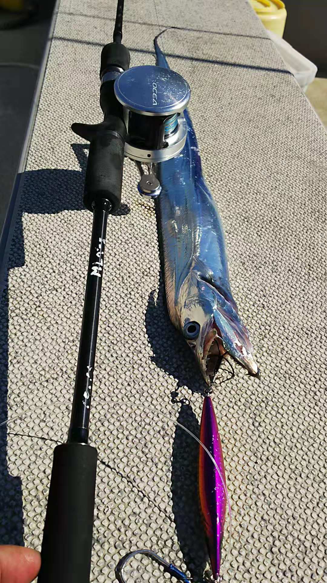 では早速・・・着底を取り、取り敢えずワンピッチで5回程長めのストップを入れ様子を見ると〝コンッ”と啄むようなアタリ!すかさず合わせるとやってきました太刀魚君!指四本位のサイズで聞いていたよりややマシだなって思うサイズでした。