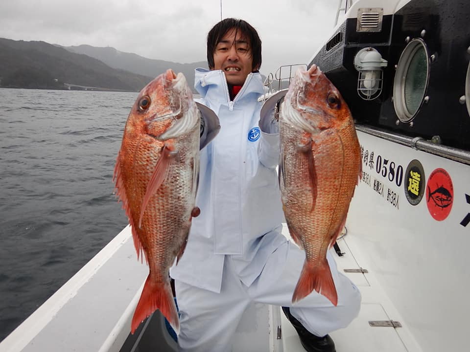 一緒に来た友人も普段とは違う海域と釣り方に悩みながらも土肥沖初挑戦で無事真鯛ゲットでした。