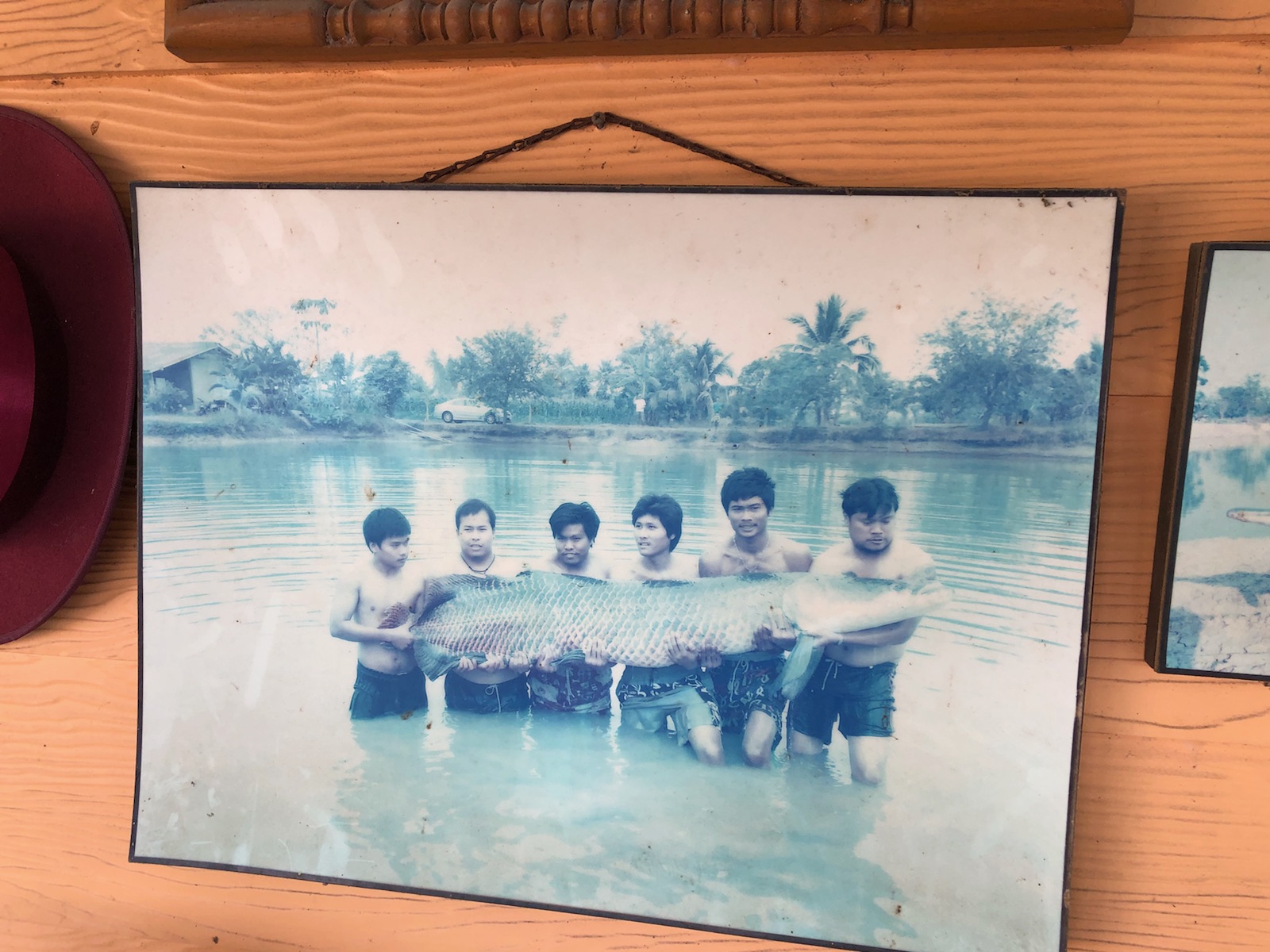 大きいピラルクが釣れ数人で抱き抱えていますが
