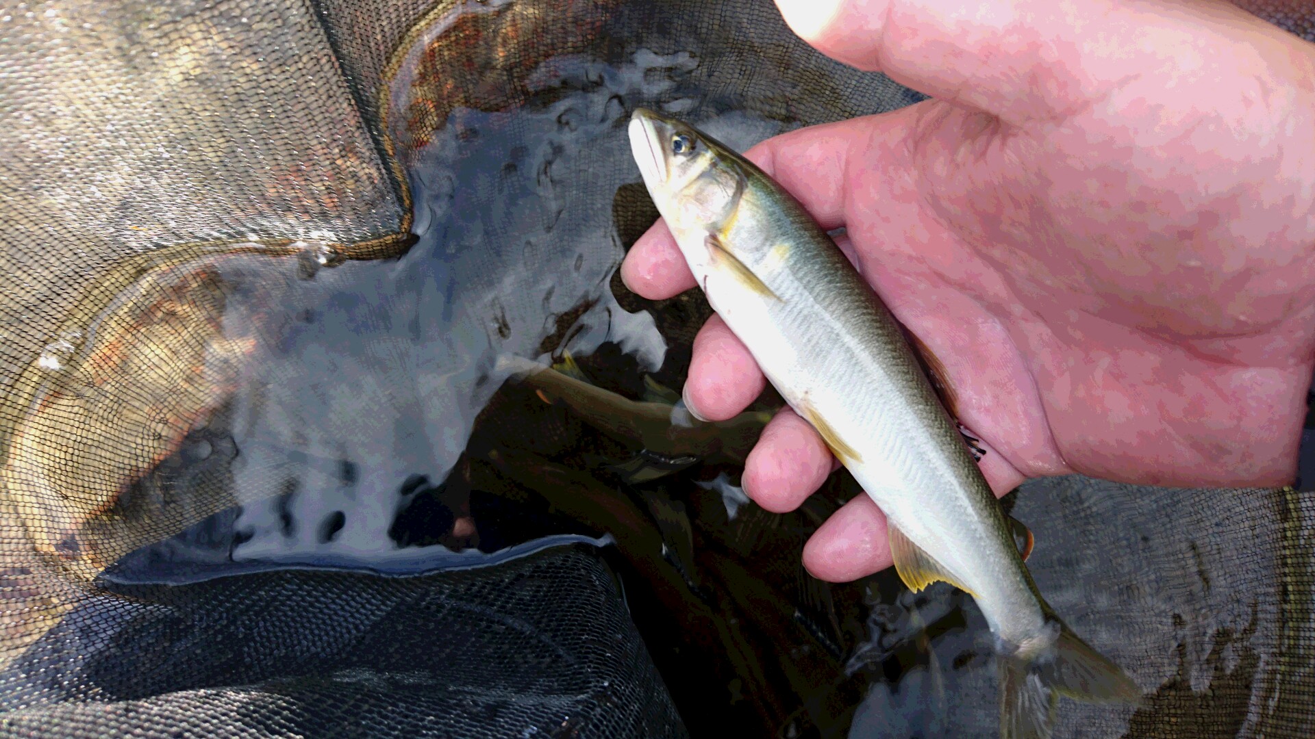 時間帯も良かったのでしょう。浅場でも鮎は全く視認出来ませんが、泳がせ釣りによく反応し25匹の釣果。少し水深のあるポイントは型も一回り大きく20cm近いサイズも混じりました。